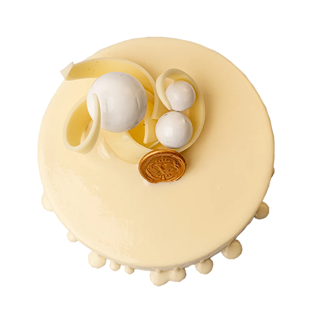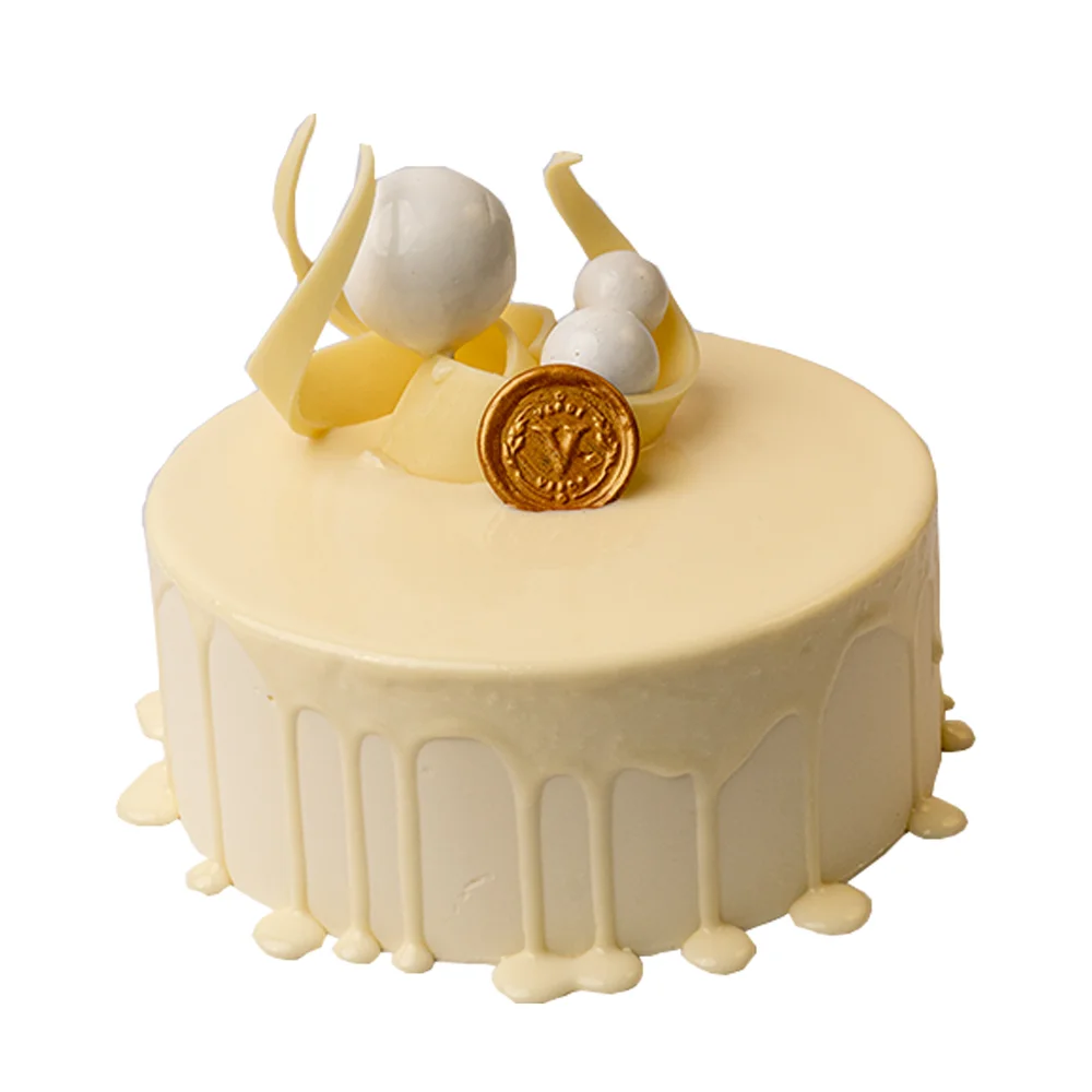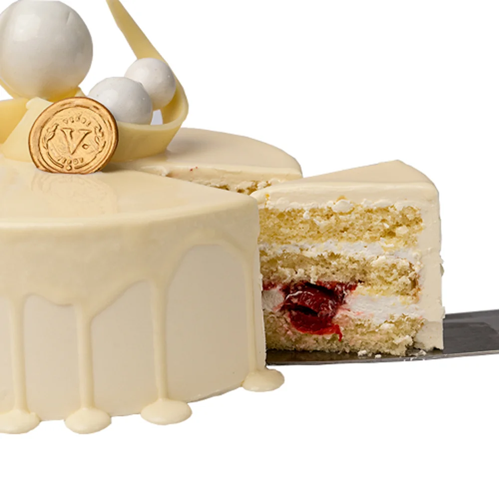 A pristine vision in white. Layers of feather-light vanilla sponge and white chocolate mousse hide a vibrant heart of tart cherry compote. Finished with a signature white chocolate drip and artistic white chocolate curls.